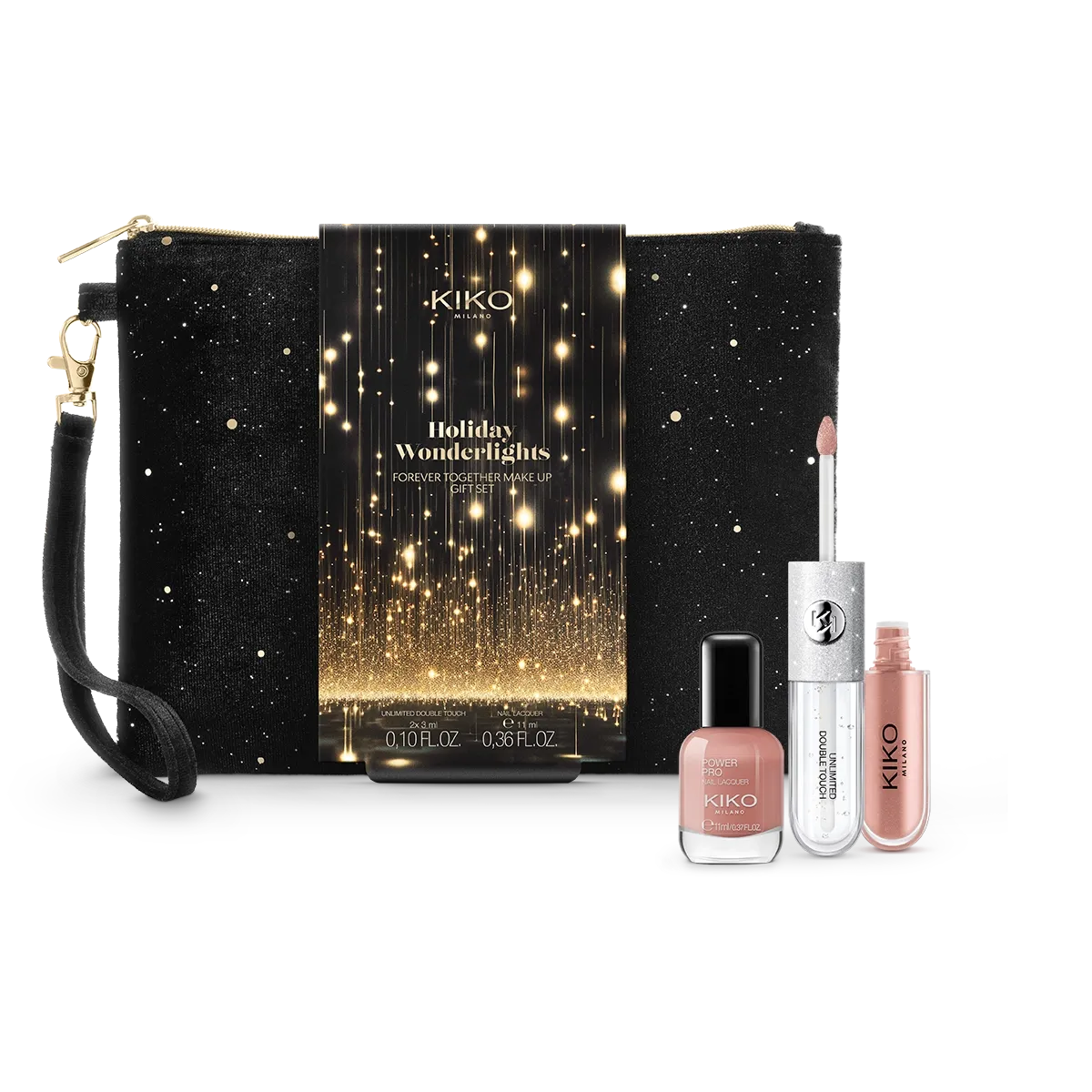 Conjunto de maquiagem constituído por um batom líquido brilhante e um verniz de unhas a efeito lustroso numa pochete preciosa.